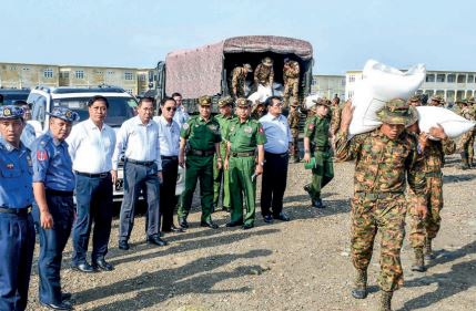 STATE Administration Council Member Deputy Prime Minister Union Minister for Transport and Communications Admiral Tin Aung San inspected the loading processes of two water tank trucks, rice, cooking oil and rations, shelters, construction materials, medicines and medical supplies into Tatmadaw vessels at Shwemingan Port of Sittway Township to transport to Maungtaw and Buthidaung townships of Rakhine State yesterday.