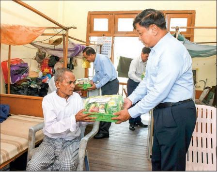 At noon, they headed to the home for the aged in Sittway and inspected the damage and donated rice, cooking oil and K4 million cash assistance to the chairman of the Rakhine State Home Association.