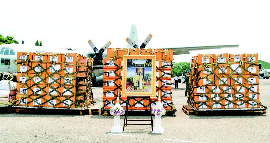 TWO C-130 Royal Thai Airforce Aircraft carrying emergency aids and relief items including shelter tents and tarpaulin sheets, portable solar cell lamps, survival bags, impregnated mosquito nets, canned fish and instant noodles donated by King Maha Vajiralongkorn Phra Vajiraklaochaoyuhua and Her Majesty Queen Suthida Bajrasudhabimalalakshana, the Royal Thai Government, Thai Red Cross Society, Thai–Myanmar Association for Friendship, Thai private sector and the People of Thailand for those affected by Cyclone Mocha in Myanmar, landed at the Yangon Airport on 23 May.