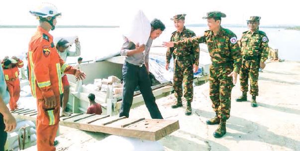 Brig-Gen Khin Zaw who arrived in Minbya Township, MraukU District along with officials inspected the volunteering works of local battalions and department staff on the Kaladan 6 vessel belonging to the local shipping department carrying rice and food items sent by the Rakhine State government.