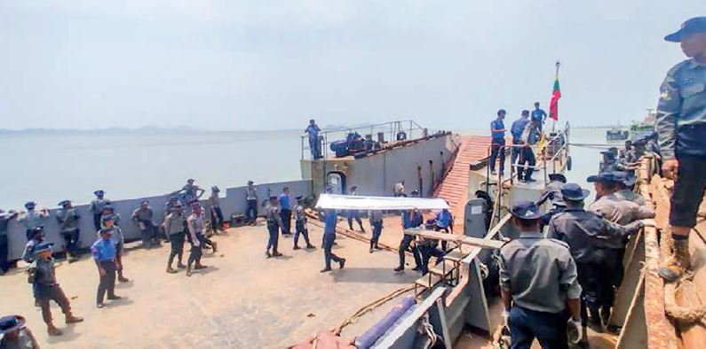 TO provide necessary assistance to cyclone-affected people in Sittway of Rakhine State where loss and damage were suffered by Mocha, a 29-metre landing craft of Tatmadaw Navy brought 3,000 CI sheets, 52 bundles of tarpaulins, 50 tarpaulin sheets, 216 boxes of nails, 16 tarpaulin tents, 6,000 eggs, 184 packs of instant noodles, 3,450 toothbrushes and 18,000 toothpaste tubes, 50 empty water bottles,450 toilet bowls and 450 pipes, 5,000 oral rehydration salt sachets and construction tools totalling 55 tonnes from three vessels of MV Aquarius, MV Sunshine and MV Fortune at Essar port of Sittway and left for a docking place in Pauktaw Township yesterday.