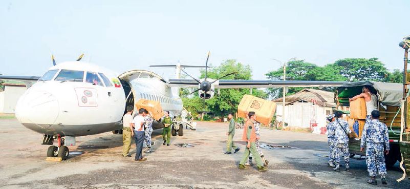 THE relief materials and food items contributed by the families of Tatmadaw (Army, Navy and Air) and well-wishers and relief supplies provided by the National Disaster Management Committee for local communities affected by the natural disaster in Rakhine State are being transported by Tatmadaw aircraft, helicopters and vessels.