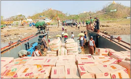 A 29-metre landing craft from the Tatmadaw (Navy) transported relief items, foodstuffs and utensils totalling 24 tonnes to Rathedaung and Buthidaung Ports from Yaychanpyin Port yesterday morning.
