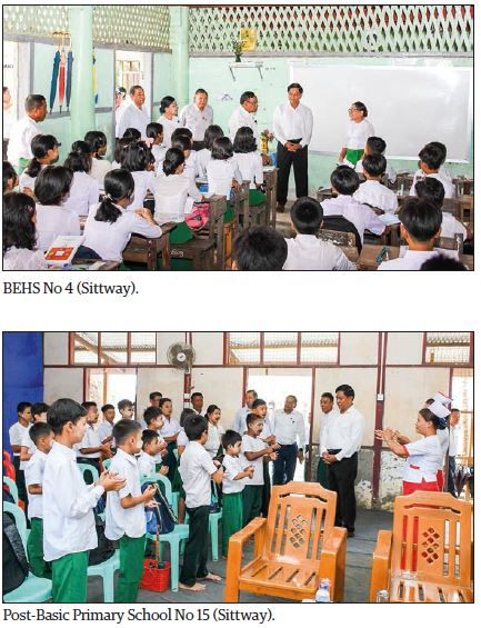 First, the Deputy Prime Minister and party went to No 1 and No 4 basic education high schools in Sittway Township and oversaw the learning session of students, receiving of government's free uniform, textbooks, notebooks and pencils, ball-pens for students, the condition of whether there are enough school buildings, classroom, desks and teaching aid, teacher and student ratio and school health activities of Public Health Department.