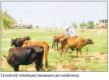 The Livestock Breeding and Veterinary Department under the Ministry of Agriculture, Livestock and Irrigation also conducted vaccination programmes for the cattle, pigs and goats in 34 wards and villages and six military units of Kyauktaw, Sittway, Ponnagyun, Minbya, Pauktaw, Myebon, Buthidaung and Rathedaung townships between 21 and 30 May. The department also provided 13 types of vaccines to prevent animal diseases in Kyauktaw, MraukU, Minbya, Pauktaw and Rathedaung townships and conducted education programmes in Khanaunggyi Village of Rathedaung Townships.