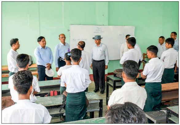 At Technological University (Sittway), the Admiral asked about repairing lecture halls, learning students and transport facilities. At No 10 BEHS in Thetkepyingon Village of Sittway Township, the Admiral asked about progress in repairing the classrooms and buildings, the number of classrooms in good condition and students, the ratio of students to teachers, and happy learning of students and fulfilled the needs.