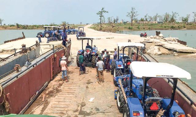 Another two landing crafts shipped 14 tractors of the Ministry of Agriculture, Livestock and Irrigation from Yaychanpyin Port toAngumaw Port yesterday morning.