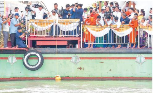 The ash urns were conveyed to the mid-stream of the Ayeyawady River near Minyehla Jetty.