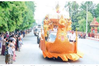 Masoeyein Taikthit Sayadaw and members of the Sangha, Union Minister for Religious Affairs and Culture U Ko Ko, Mandalay Region Chief Minister U Myo Aung, Commander of Central Command Maj-Gen Ko Ko Oo and officials, conveyed the ashes onto the decorated float.