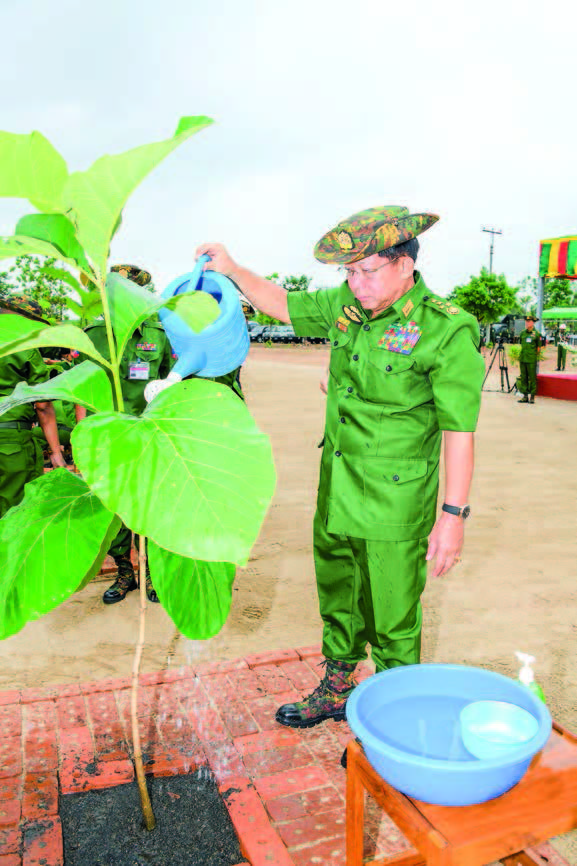 Chairman of the State Administration Council Commander-in-Chief of Defence Services Senior General Min Aung Hlaing grew a teak tree at the first monsoon tree-growing ceremony of families of the Office of the Commander-in-Chief (Army, Navy and Air) near Yezin Dam in Zeyathiri Township of Nay Pyi Taw yesterday.