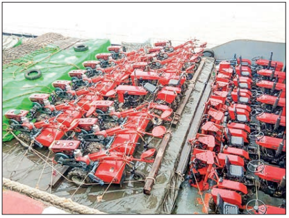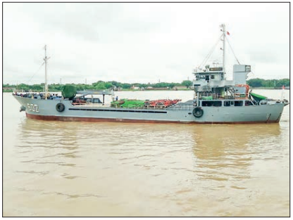 The vessel containing 13,850 bags of rice weighing 40 kilogrammes each, 568 six-pyi rice bags, 400 cartons of readyto-eat rice, 10 mini tractors, and 14 power-tillers donated by the Ministry of Agriculture, Livestock, and Irrigation; 650 cartons of blankets and mosquito nets, and 18,930 sets of school uniforms provided by the Department of Disaster Management; and 2,333 cartons of nails donated by the Myanmar Economic Corporation, weighing a total of 665 tonnes of cargo.