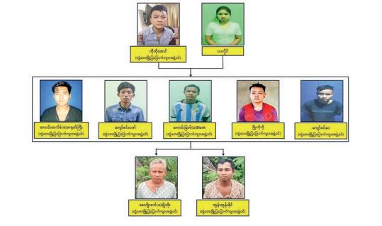 THREE terrorists robbed Myat Maung diamond and gold jewellery shop located in Maydawi Street of (Zamyinzwe) ward of North Okkalapa Township on 18 June evening. It has already announced on 19 June that a total of nine suspects — eight males and one female were arrested along with the arms within five hours after the case.