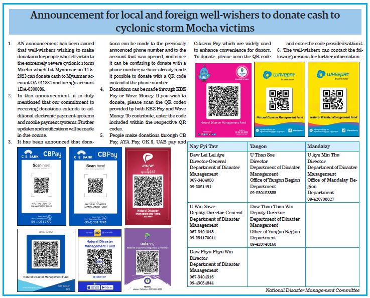 Submitted by moiuser on 22 June 2023 Announcement for local and foreign well-wishers to donate cash to cyclonic storm Mocha victims