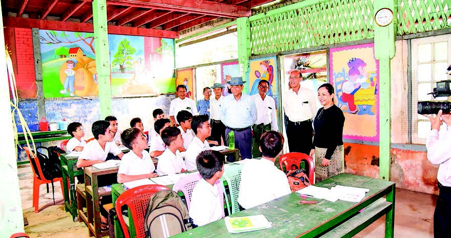 SAC Member Deputy Prime Minister Union MoTC Minister Admiral Tin Aung San, accompanied by Union ministers Lt-Gen Tun Tun Naung, U Myo Thant and Dr Thet Thet Khine, deputy ministers and officials, oversaw the peaceful learning of students at the basic education schools in Sittway and warmly greeted them yesterday.