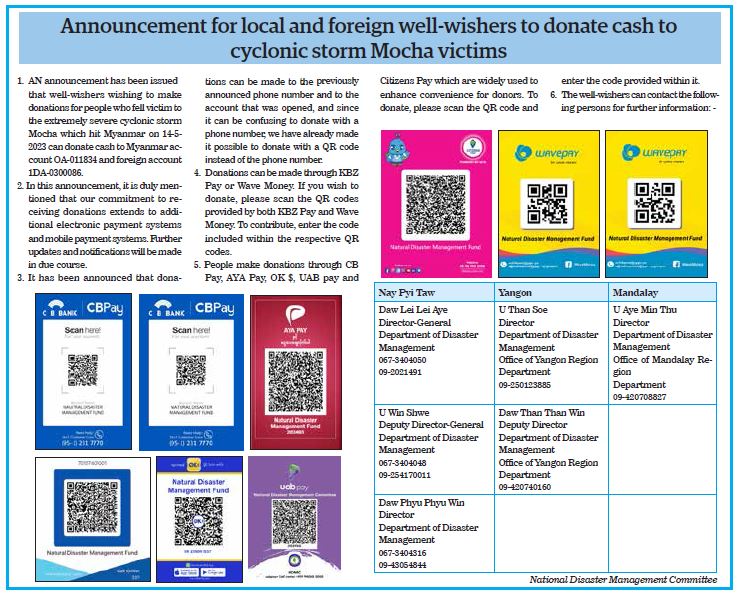 Submitted by moiuser on 11 July 2023 Announcement for local and foreign well-wishers to donate cash to cyclonic storm Mocha victims