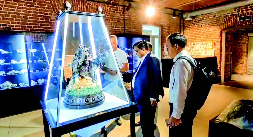 The Union minister also visited the Stone-Crafting House by Alexey Antonov in Yekaterinburg yesterday morning and viewed the ancient animal fossils, a variety of stones collected from all over the world, carved stone sculptures in various sizes, and Russia’s oldest excavated gold and stone paintings.