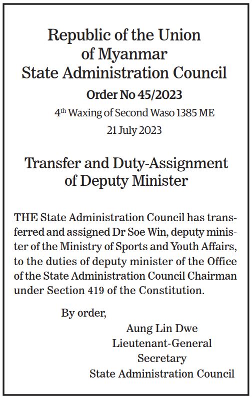 Submitted by moiuser on 22 July 2023 Republic of the Union of Myanmar State Administration Council Order No 45/2023