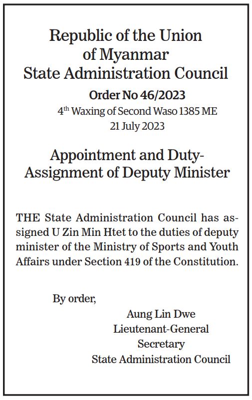 Submitted by moiuser on 22 July 2023 Republic of the Union of Myanmar State Administration Council Order No 46/2023