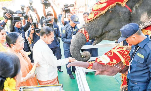 The Senior General and wife presented the birthday gift for the elephant to an official whereas the Vice-Senior General and wife fed Rattha Nandaka and his mother.