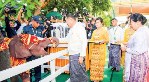 Chairman of the State Administration Council Prime Minister Senior General Min Aung Hlaing and wife Daw Kyu Kyu Hla, SAC Vice-Chairman Deputy Prime Minister Vice-Senior General Soe Win and wife Daw Than Than Nwe sprinkled scented water on the one-year old white elephant.