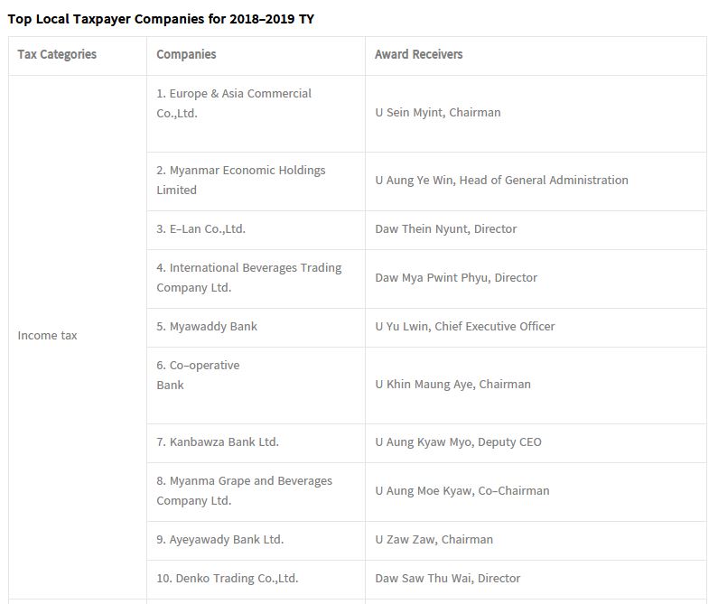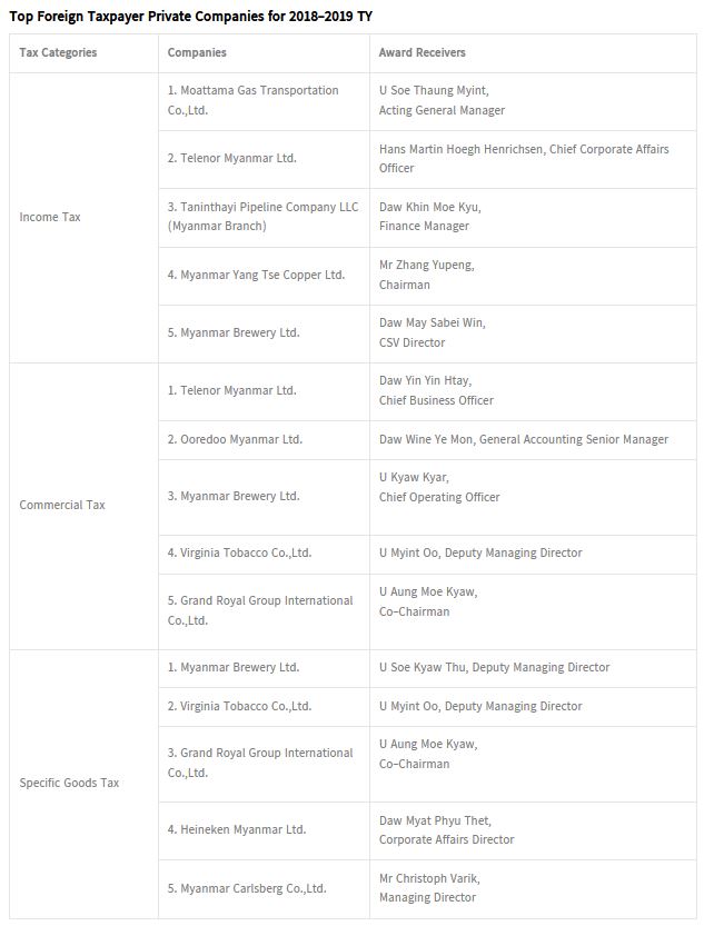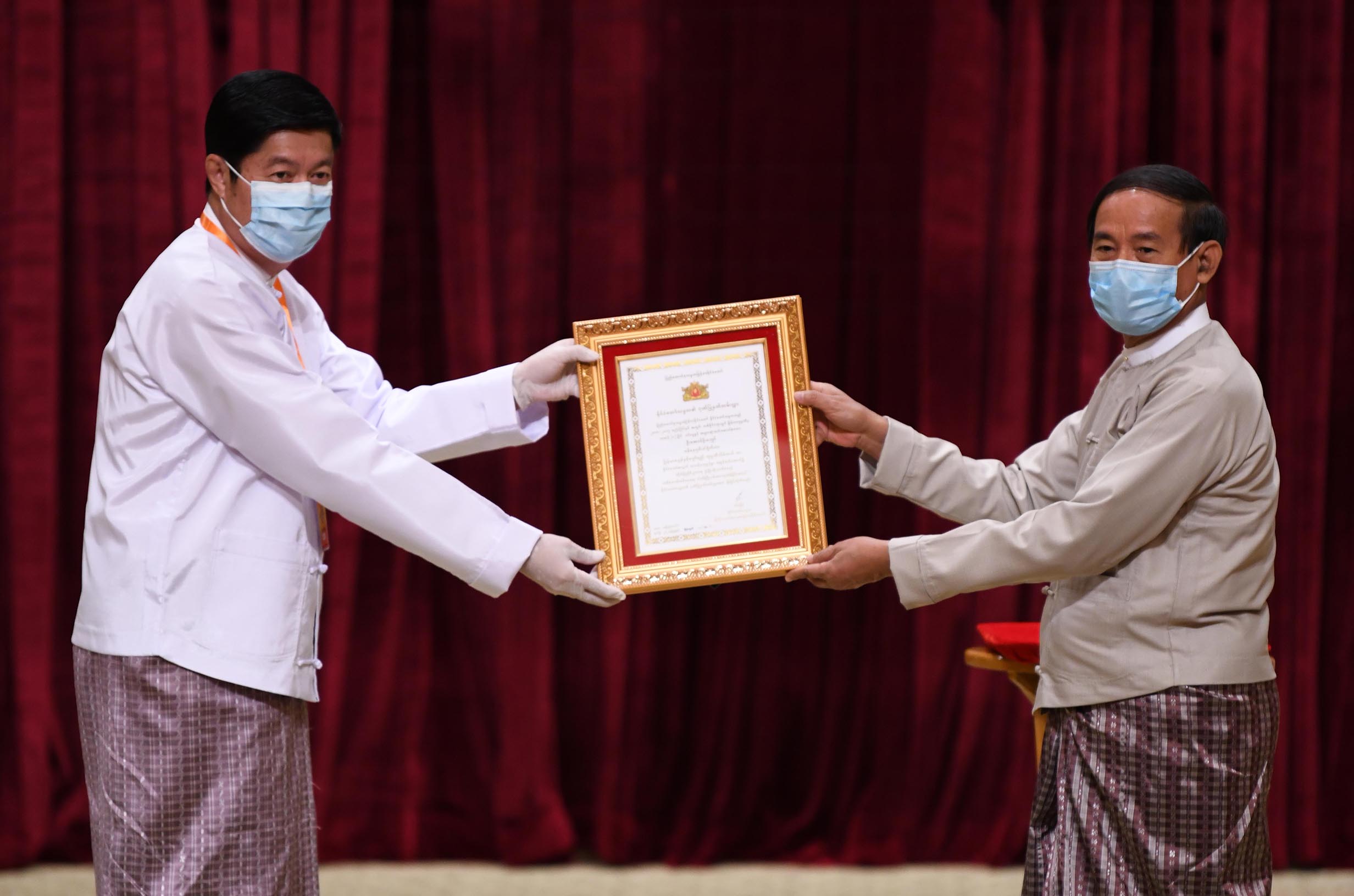 President U Win Myint attended the ceremony held at the Presidential Palace in Nay Pyi Taw, and presented awards to the outstanding taxpayers for income tax, commercial tax, and specific goods tax.