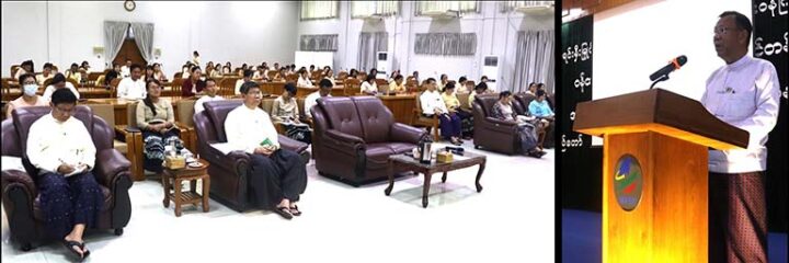 Ministry of Investment and Foreign Economic Relations (MIFER), aiming to develop human resources and to improve the capacity of staff, the 35th ceremony of Friday Talk of Knowledge Sharing Programme-KSP was held at Office No 1, Nay Pyi Taw, yesterday. Union Minister for Investment and Foreign Economic Relations Dr Kan Zaw attended and delivered the opening remarks.