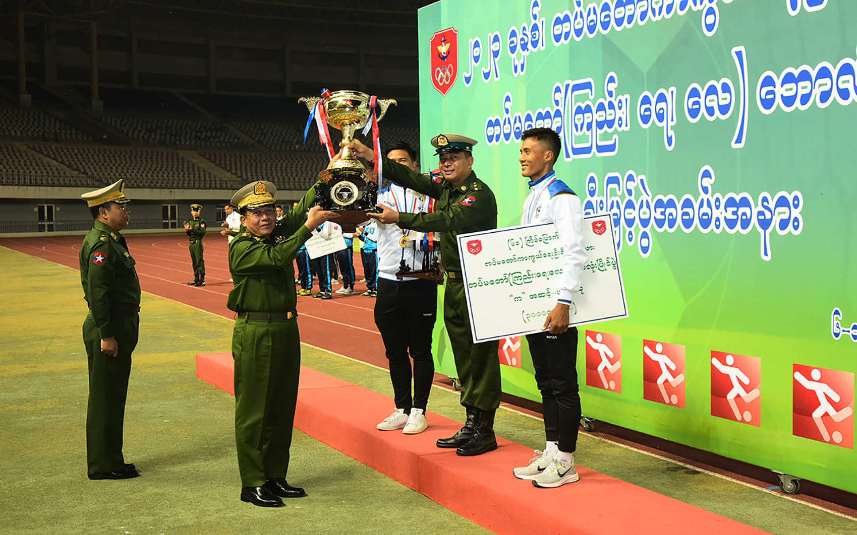 The Senior General presented a championship trophy, a duplicate trophy and a cash award to the Camp Commandant’s Office team of the Office of the Command-in-Chief (Army) which stood first in the A-class football tournament. At the ceremony, senior military officers also presented prizes to the respective winning teams. In the tournament, the South-West Command team and Yangon Command team secured the fair play awards in the B and A class football tournaments.