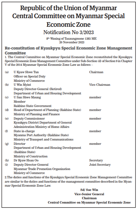 Submitted by moiuser2 on 25 November 2023 Re-constitution of Kyaukpyu Special Economic Zone Management Committee
