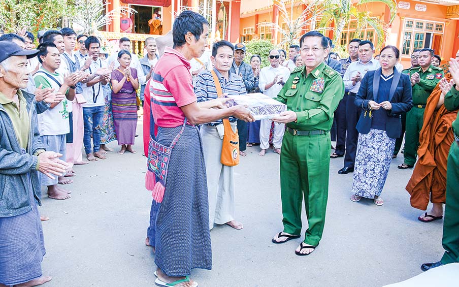 Chairman of the State Administration Council Prime Minister Senior General Min Aung Hlaing and his wife Daw Kyu Kyu Hla yesterday afternoon, met temporary IDPs at Thiri Mingala Mansu Shan Monastery in Lashio.