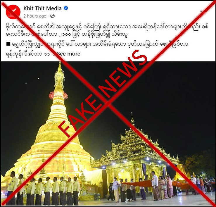THE Khit Thit media has spread fake news on social media that the pagoda boards of trustees said the cash donation and entrance fees (dollars deposited at banks) received from Shwedagon pagoda and Botahtaung pagoda are seized and exchanged into Myanmar Kyats at K2,100 per dollar.