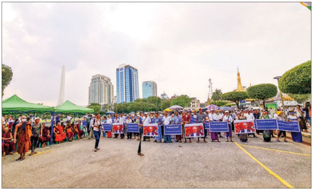 A protest against Timor-Leste and foreign countries interfering in Myanmar’s internal affairs, led by a group of nationalist activists, was held yesterday at the parking lot next to Maha Bandula Park in front of Yangon City Hall.