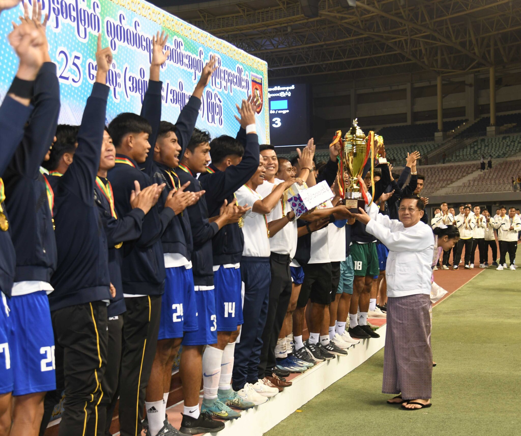 Chairman of the State Administration Council Prime Minister Senior General Min Aung Hlaing awarded the winning teams in the Inter-Ministry Men’s Football Tournament in commemoration of the 76th Anniversary of Independence Day at Wunna Theikkdhi Stadium in Nay Pyi Taw yesterday.