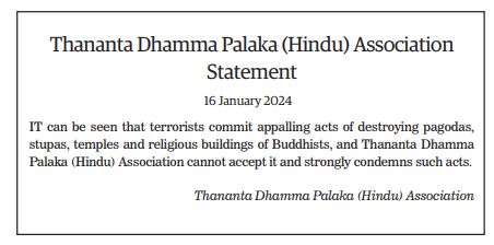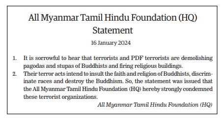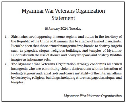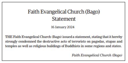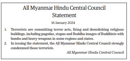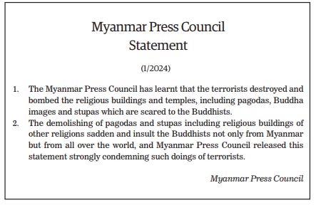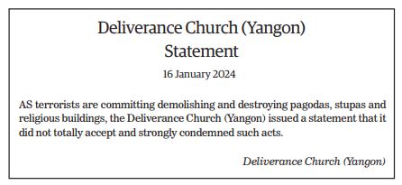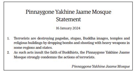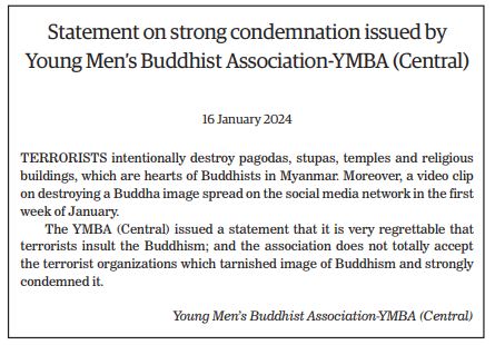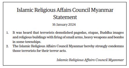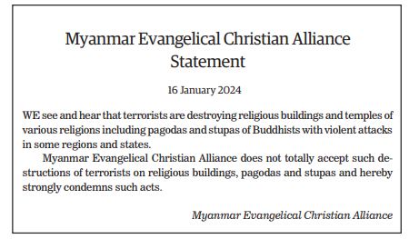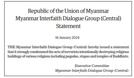 The Young Men’s Buddhist Association (YMBA) (Central), Myanmar Interfaith Dialogue Group (Central), Myanmar Evangelical Christian Alliance, Union of Myanmar Methodist Church (Lower Myanmar), Faith Evangelical Church (Bago), Deliverance Church (Yangon), All Myanmar Hindu Central Council, All Myanmar Tamil Hindu Foundation (HQ), Thananta Dhamma Palaka (Hindu) Association, Myanmar Islamic Association, Pinnaygone Yakhine Jaame Mosque, Buthidaung-Maungtaw Region Development Association, Myanmar War Veterans Organization, Myanmar Press Council, Myanmar Sports Media Federation, Myanmar Motion Pictures Organization Myanmar Music Association (Central), Myanmar Artists Association (Central), Myanmar Theatrical Association (Central), Myanmar Comedians’ Association, and Myanmar Writers Association issued statements strongly condemning the acts of terrorism that seriously affect the religious sector.