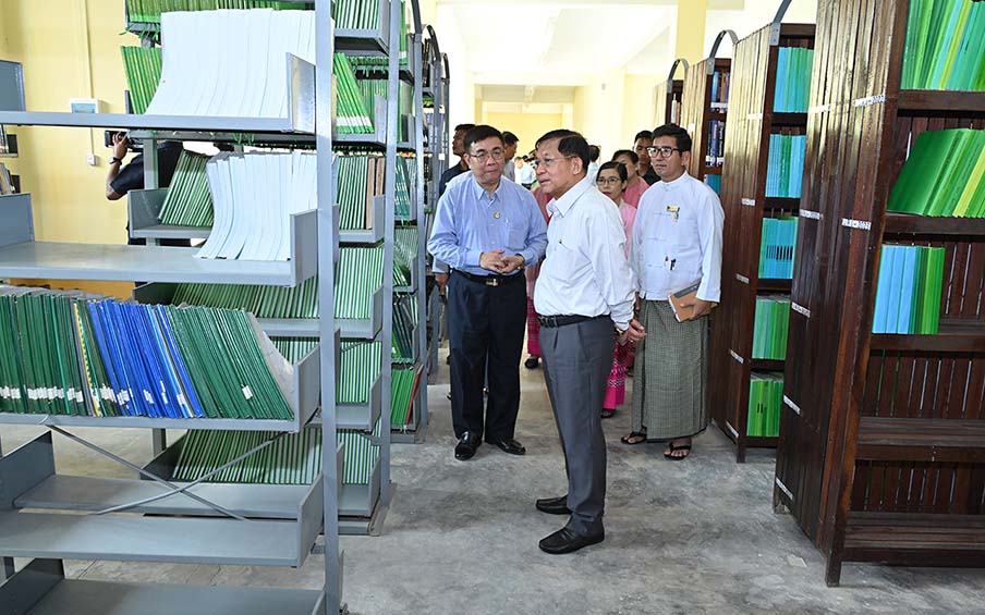 Union Minister for Education Dr Nyunt Pe, the Region chief minister and officials reported on functions of Pathein University and construction of the library and buildings for academic matters, academic and management measures, and beautification tasks of the university and environs.