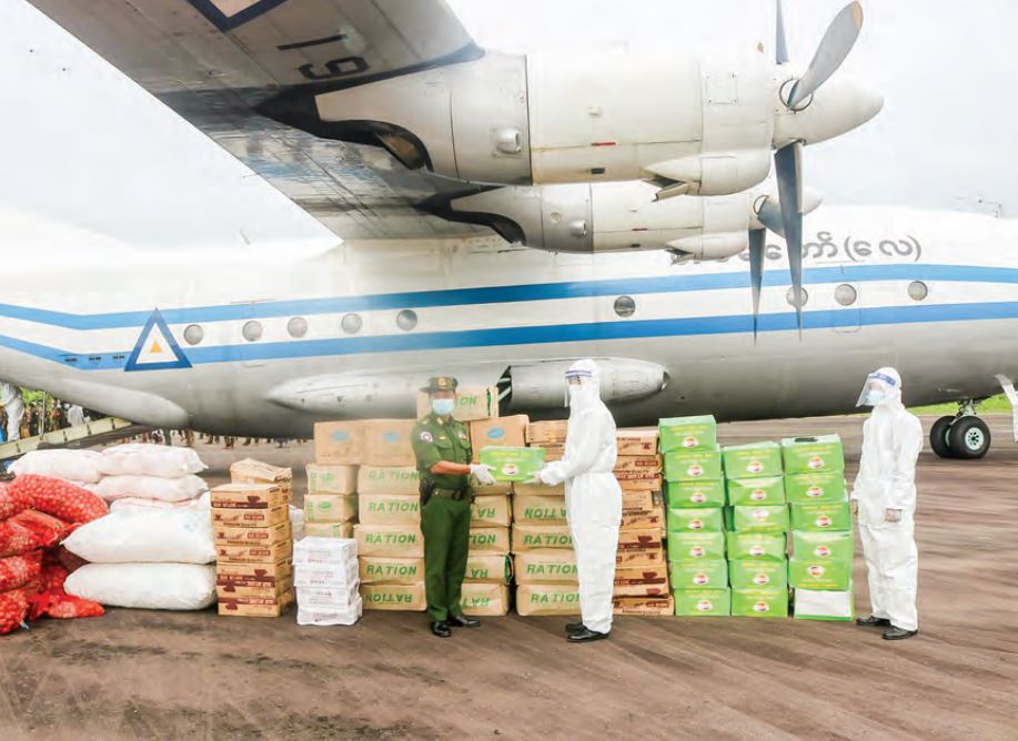 The military cargo plane left Yangon Airport and arrived in Sittway with the assistance to prevent, contain and treat COVID-19. The medical unit consists of an anesthesiologist, a lab technician, a physician, 2 medics and 10 nurses. The equipment include an oxygen plant, an ICU Ventilator (SV-300), 2 ICU beds, 3 suction machines, 3 pulse oxymeters, 3 patient monitors, 3 infusion pumps, 3 syringe pumps, a video laryngoscope, a mini-centrifuge, 10 oxygen cylinders (40L), an oxygen concentrator (5L), 3 BP Cuffs, 5 UV lamps, and 134 different types of medicine and apparatuses.