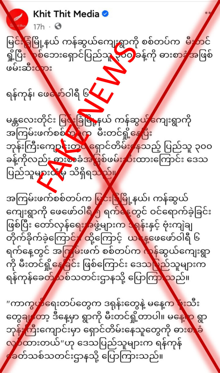 MALICIOUS news media named Khit Thit media is spreading false information that the security forces entered Kanswe village, Myingyan Township, Mandalay Region, on 5 February, and the security forces set fire to the village because PDF terrorists attacked the village with a drone and about 300 people who were hiding in the monastery were taken as hostages.