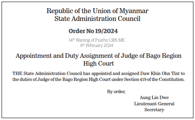 Submitted by moiuser2 on 9 February 2024 Appointment and Duty Assignment of Judge of Bago Region High Court