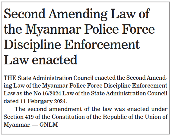 Submitted by moiuser2 on 12 February 2024 Second Amending Law of the Myanmar Police Force Discipline Enforcement Law enacted