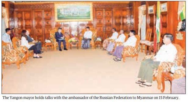 A delegation led by Mr Iskander Azizov, Ambassador of the Russian Federation to Myanmar, met Yangon Region Minister for Development Affairs and Yangon City Development Committee (YCDC) Chairman Mayor U Bo Htay and party on 15 February to discuss issues related to the promotion of friendship and cooperation between Myanmar and Russia.