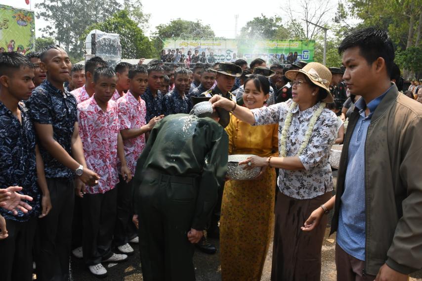 At the Yaynan Cherry pavilion in PyinOoLwin Station, the wife of the Senior General and the party watched songs and dances of choral dance troupes and participation of Tatmadaw members and families at the water-throwing festivities. The wife of the Senior General and party sprinkled water on Tatmadaw members and families and presented cash awards to dance troupes, Tatmadaw members and families. The wife of the Senior General and party also enjoyed the water-throwing activities at Cherry Arman Hnit Oo Thingyan pavilion of the Defence Services Academy. The wife of the Senior General and party doused cadets, Tatmadaw members, families and choral dance troupes and presented cash awards.