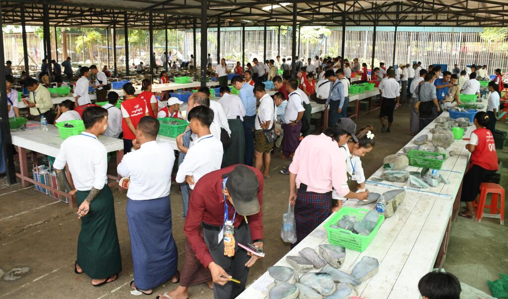 The 59th Myanmar Gems Emporium is scheduled from 3 to 12 May at the Maniyadana Jade Hall in Nay Pyi Taw. Throughout the exhibition, 182 lots of pearls were sold on the second day, followed by 197 lots on the third day, 88 lots of gems on the fourth day, 546 lots of jade on the fifth day, 569 lots of jade on the sixth day and 424 lots on the seventh day.