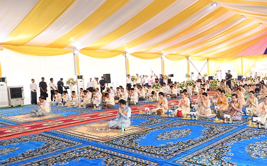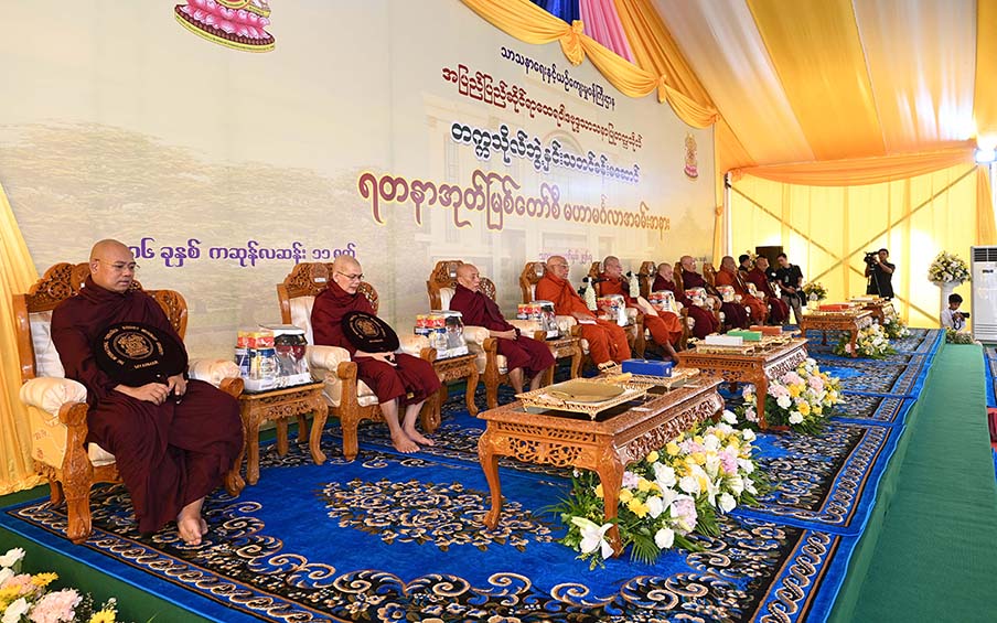 First, Chairman of the State Administration Council Prime Minister Senior General Min Aung Hlaing, his wife Daw Kyu Kyu Hla, who led the congregation, took the Five Precepts from Secretary of State Sangha Maha Nayaka Committee Vice-Chancellor of the University Presiding Patron of Masoeyein Taikthit from Mahaaungmye Township of Mandalay Region Presiding Patron of Dhamma Thameikdi Monastery Agga Maha Pandita Agga Maha Saddhamma Jotikadhaja Bhaddanta Vasettha Bhivamsa.
