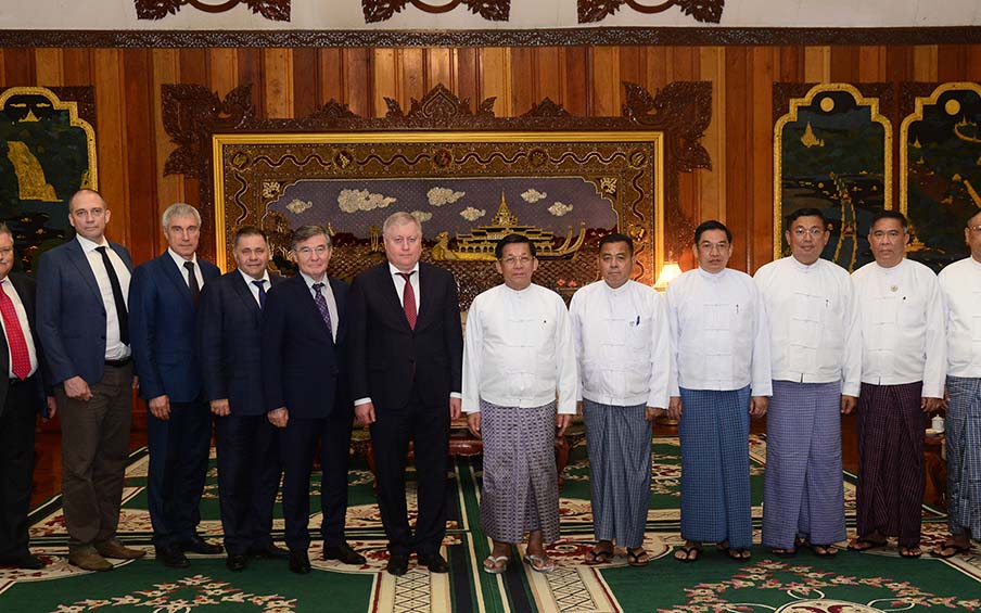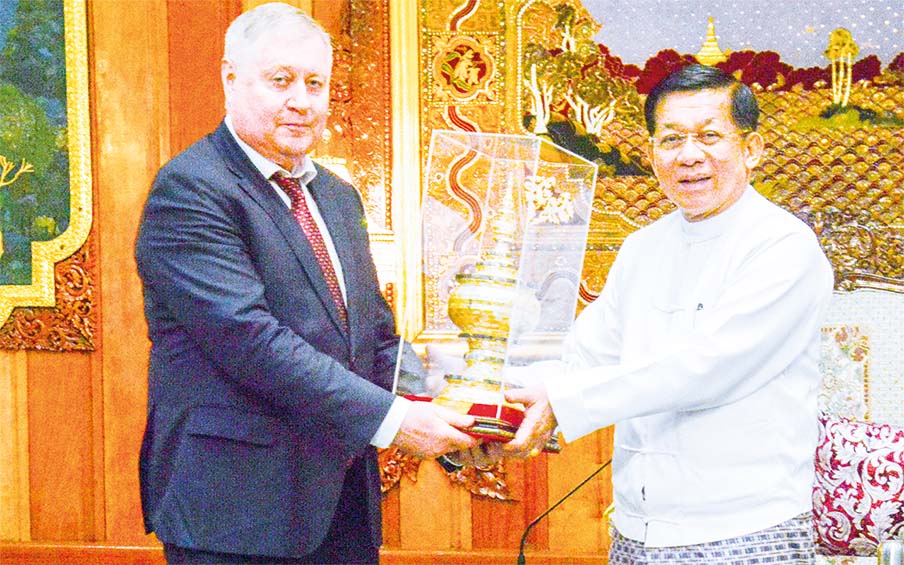 Chairman of the State Administration Council Prime Minister Senior General Min Aung Hlaing received a delegation led by Deputy Director-General of Roscosmos State Space Corporation Mr Savelyev Sergey Valentinovich of the Russian Federation at Zeyathiri Beikman on Konmyinttha of Yangon Region yesterday afternoon.