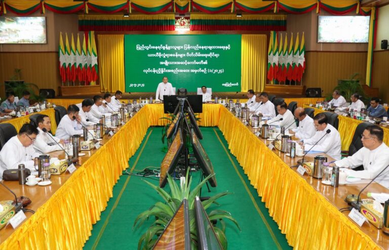 Vice-Chairman Dr Soe Win reported on relief efforts, vocational courses, and support for returnees. Regional and state ministers presented their sector-wise progress and plans. The meeting concluded with discussions and coordination by the national committee members.