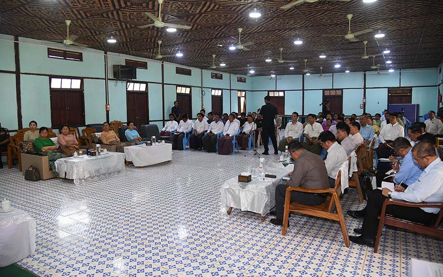 Chairman of the State Administration Council Prime Minister Senior General Min Aung Hlaing, his wife Daw Kyu Kyu Hla and his entourage met departmental officials and town elders at the office of Chauk Township General Administration Department to talk about regional development tasks yesterday afternoon.