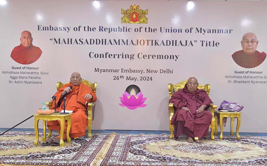 The conferring ceremony of religious titles ‘Maha Saddhamma Jotikadhaja’ and ‘Saddhamma Jotikadhaja’ offered by the Government of the Republic of the Union of Myanmar was held on 26 May 2024 at the Myanmar Embassy in New Delhi.