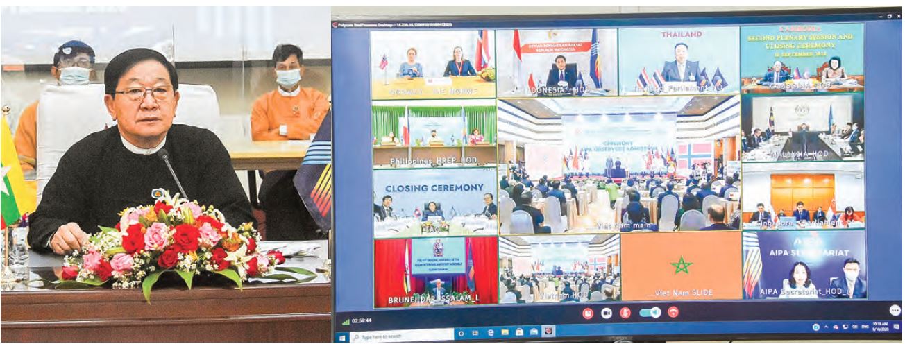 MYANMAR parliamentary delegates, led by Pyidaungsu Hluttaw and Pyithu Hluttaw Speaker U T Khun Myat, joined the second plenary session and closing ceremony of the 41st General Assembly of the ASEAN Inter-Parliamentary Assembly (AIPA-41), which took place in Ha Noi of Viet Nam, via videoconferencing yesterday morning.