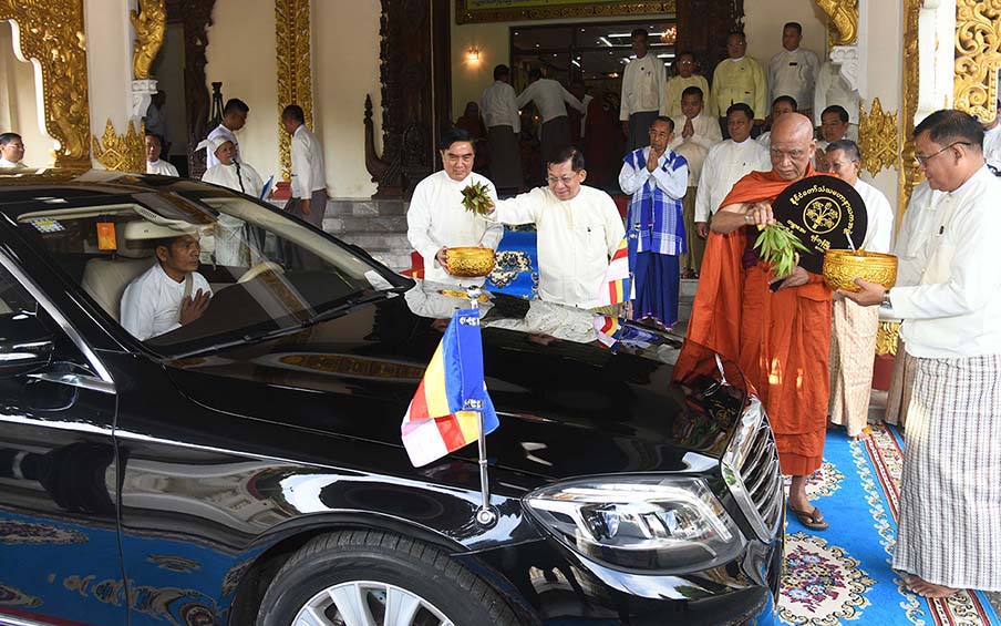 A ceremony to offer national-level regalia vehicles to member Sayadaws of State Sangha Maha Nayaka Committee by the State Administration Council took place at Wizaya Mingala Dhamma Thabin Hall on Thiri Mingala Kaba Aye Hill in Yangon Region yesterday morning, attended by SAC Chairman Prime Minister Senior General Min Aung Hlaing.