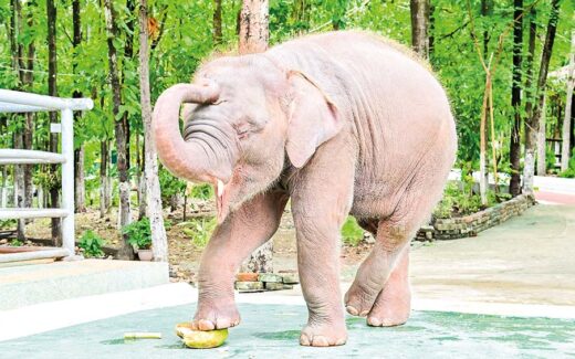 The white elephant’s name is Rattha Nandaka. It has pearl-coloured eyes, a plantain branch-shaped back, white hair, a distinctive tail with a tuft of hair at its end, auspicious plot signs on the skin, reddish-brown or pinkish skin, five claws on the front legs, four claws on the back legs and big ears. Therefore, these features conform with seven out of eight characteristics.