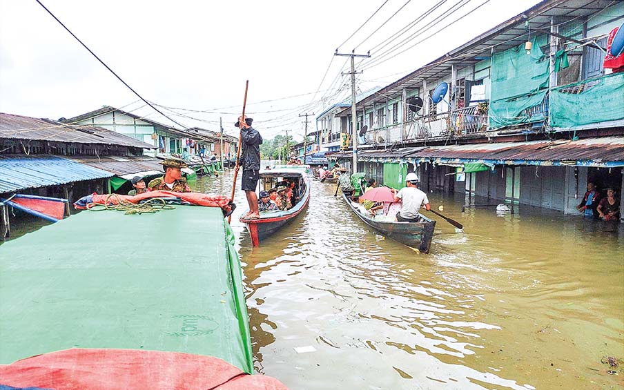 Similarly, the water level of the Chindwin River in Sagaing Region increased due to heavy rainfall. The water level reached 1,535 centimetres in Khamti yesterday, and it exceeded 175 centimetres, which is more than 1,360 centimetres of danger level. Myoma, Pawmaing, Zeephyugon wards, Aung Thaya and Sinthay villages in Khamti faced flooding.